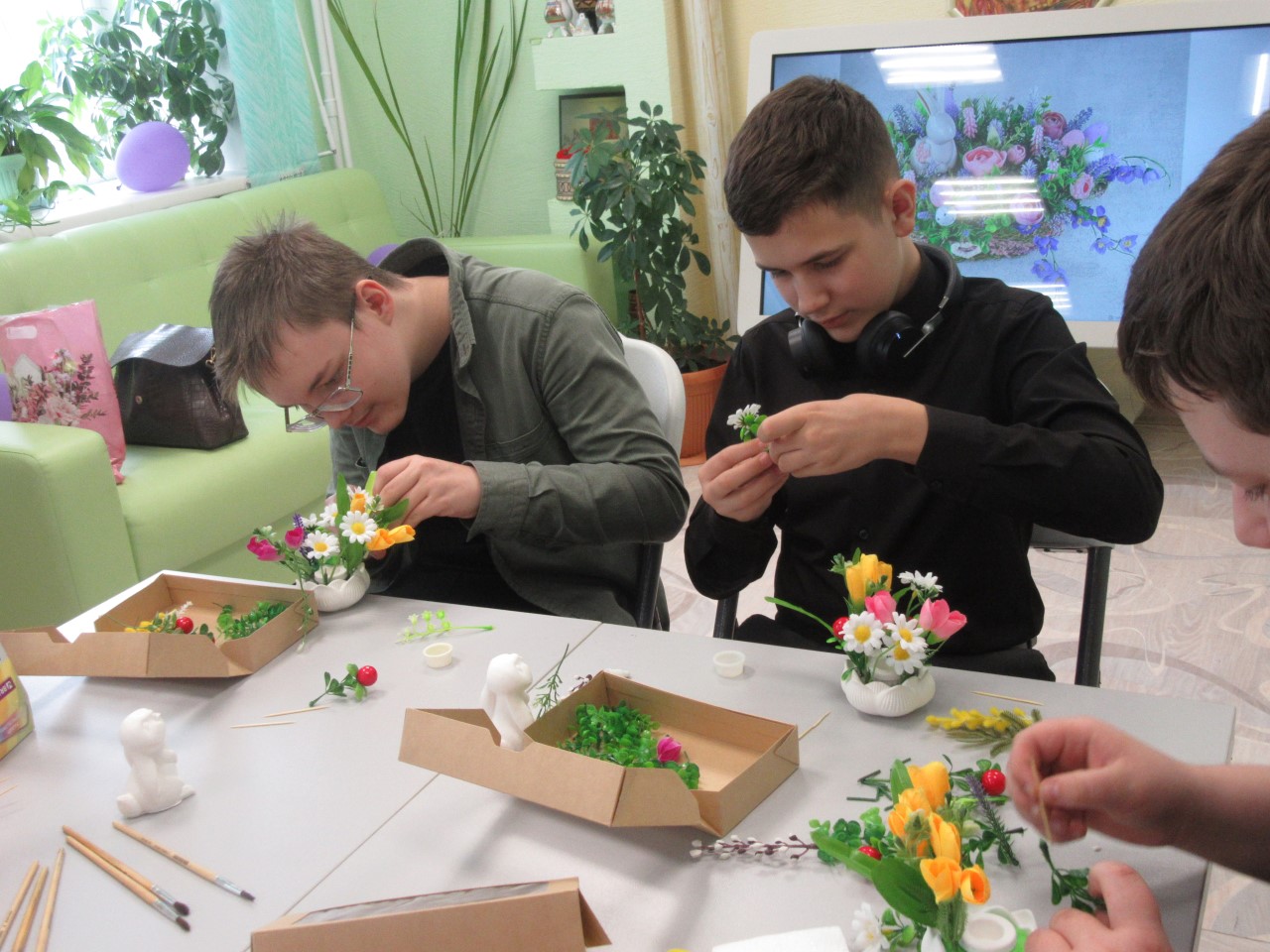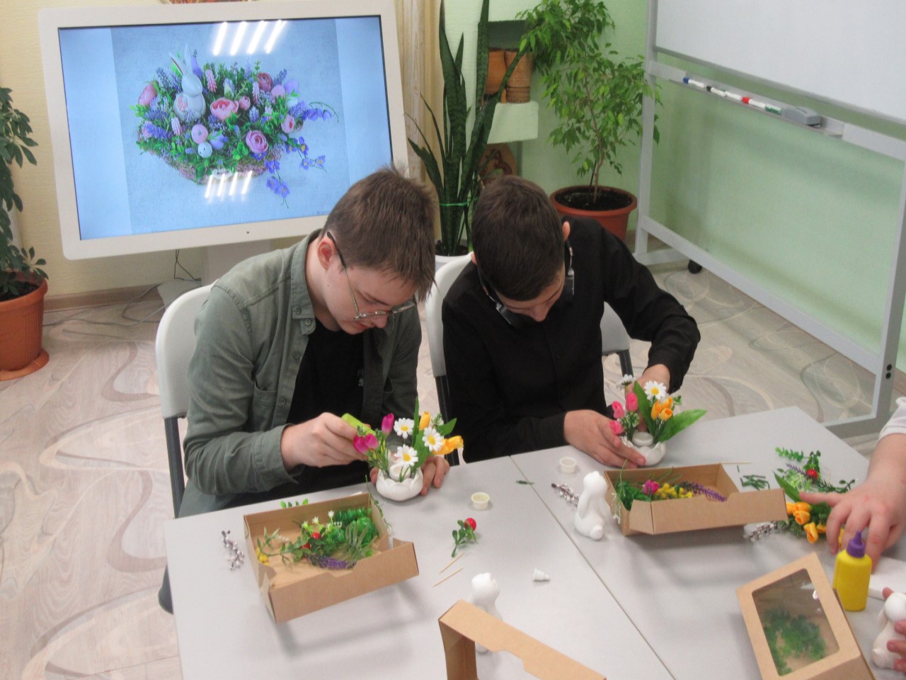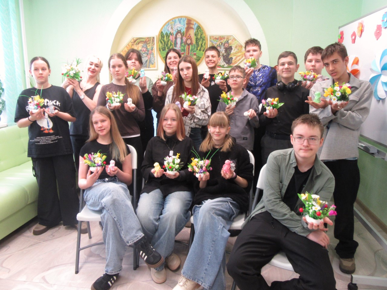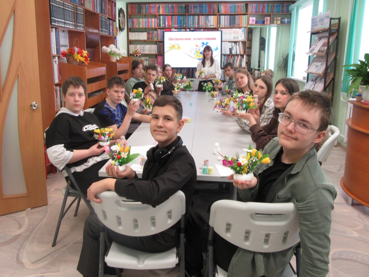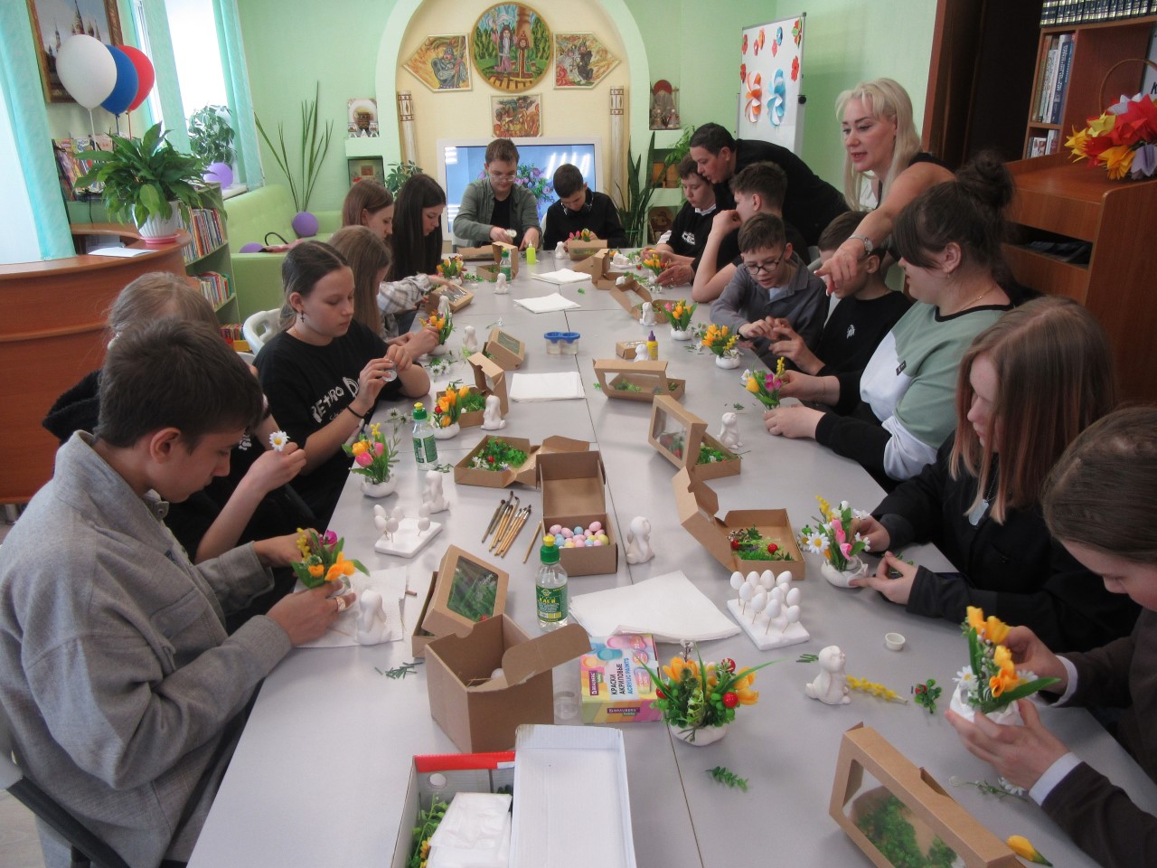 Участники самостоятельно изготавливали сувениры: букеты и подставки для них, пасхальных зайцев, следуя пошаговым инструкциям. На этом мастер-классе учащимся удалось освоить базовые художественные приёмы декорирования и составления композиций, работу с различными материалами. Под руководством мастера в атмосфере весеннего творчества и вдохновения ребята создали изящную, весеннюю композицию, которую смогут преподнести близким как современное продолжение старинной традиции.